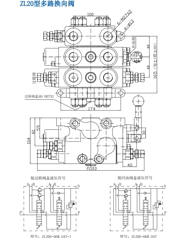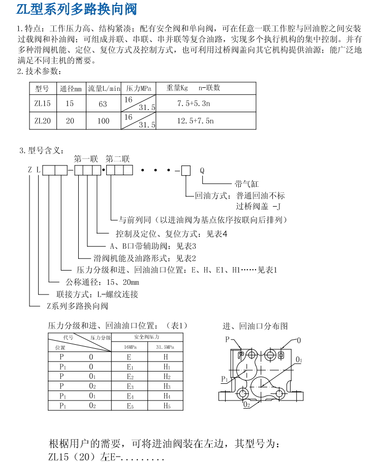 ZL型系列多路換向閥:工作壓力高、結構緊湊;配有安全閥和單向閥,可在任意一聯(lián)工作腔與回油腔之間安裝過(guò)載閥和補油閥;可組成并聯(lián)、串聯(lián)、串并聯(lián)等復合油路,實(shí)現多個(gè)執行機構的集中控制。并有多種滑閥機能、定位、復位方式及控制方式,也可利用過(guò)橋閥蓋向其它機構提供油源;能廣泛地滿(mǎn)足不同主機的需要。